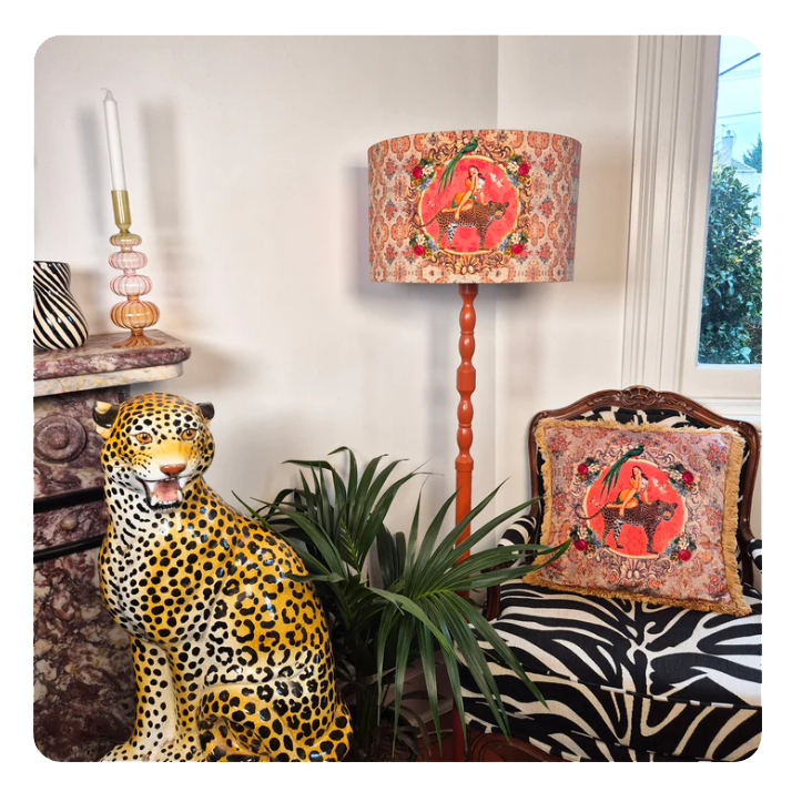To shop your matching lampshades, cushions and wallpapers, head to Queen K's website at