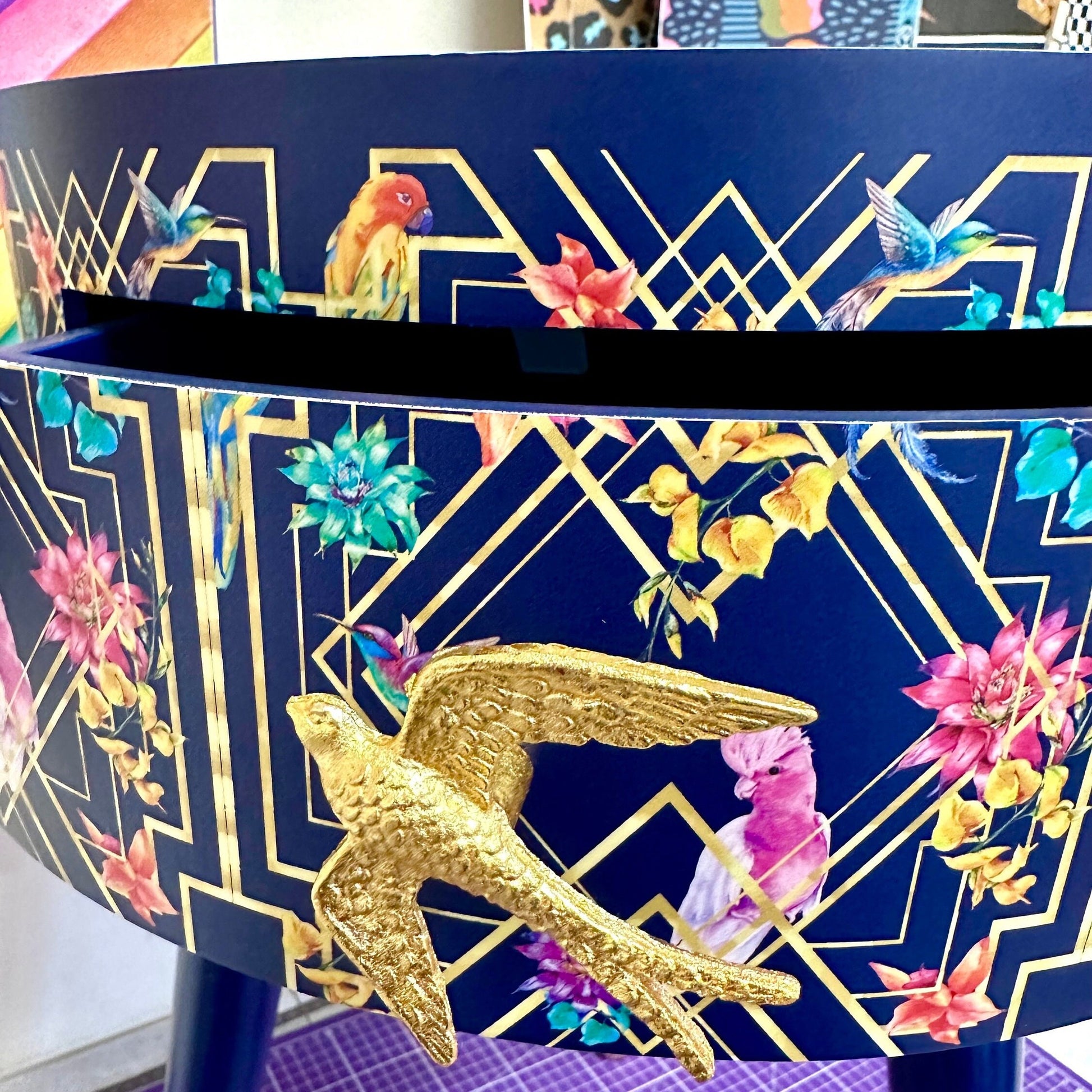 Gorgeous navy blue art deco design featuring parrots, hummingbirds and flowers nightstand, this is such a statement piece for any home.