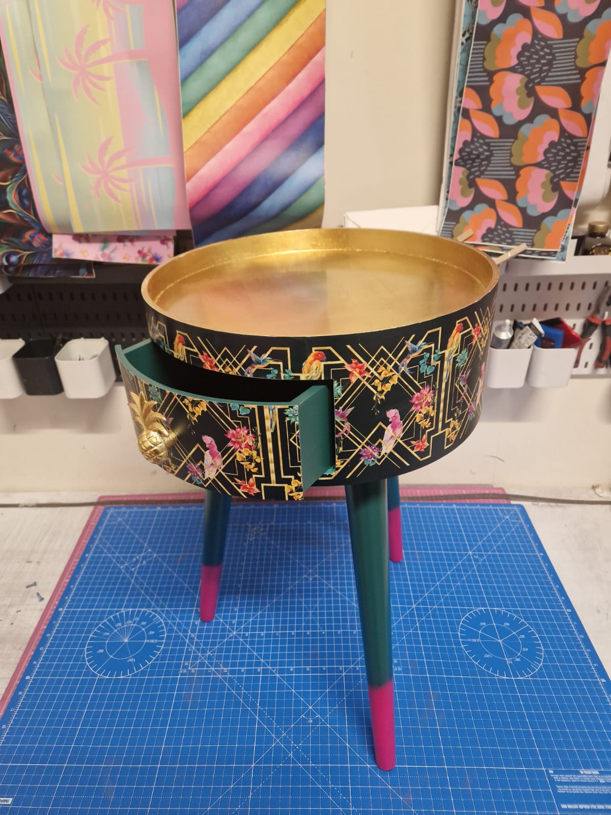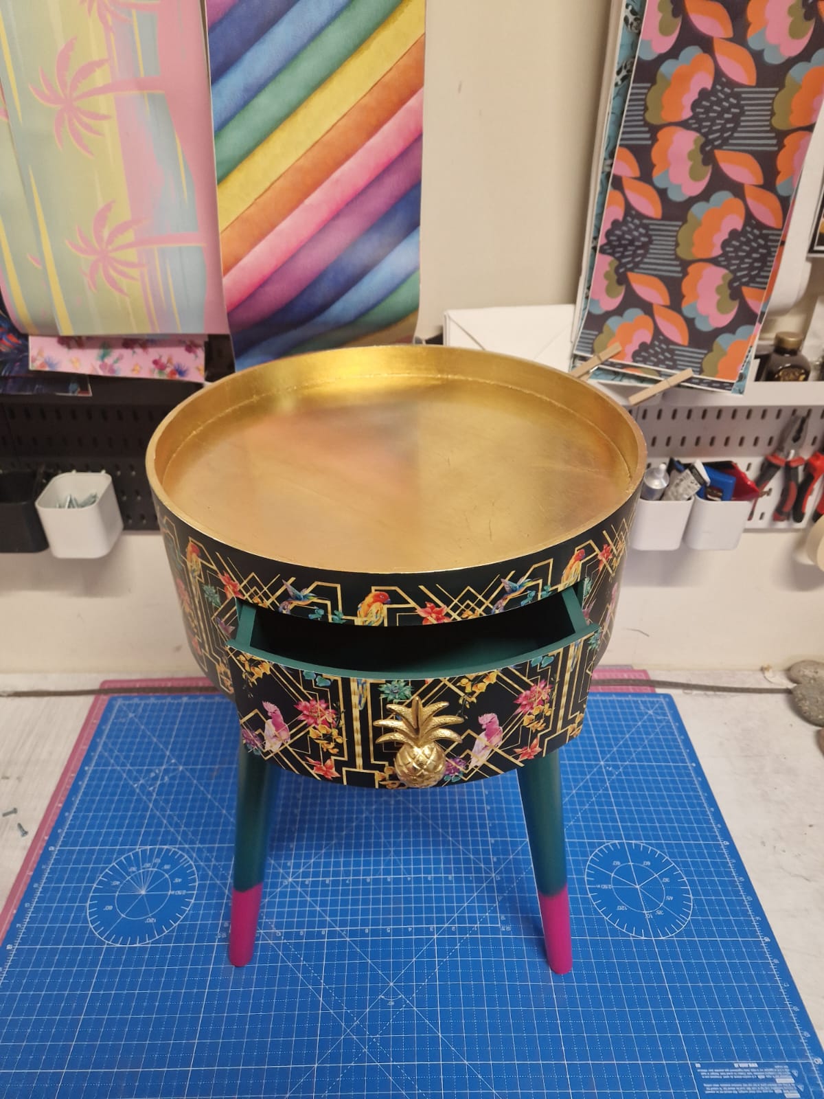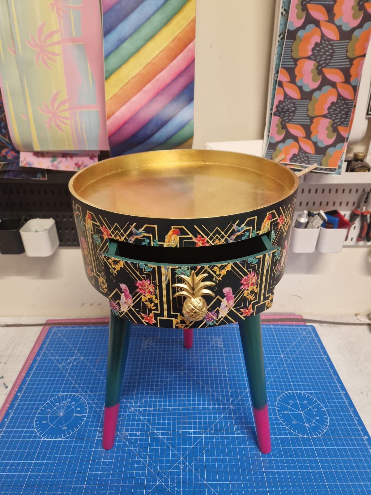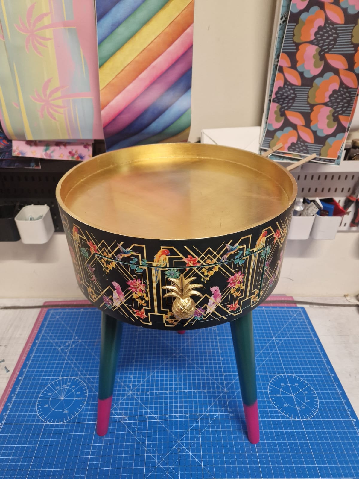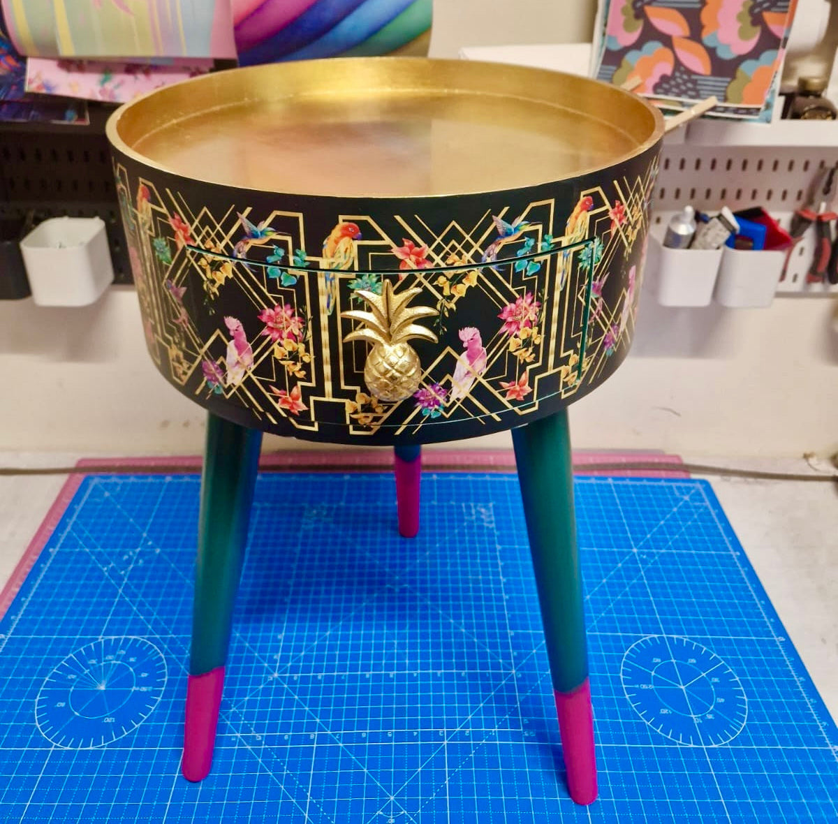 Completed with an gold painted pineapple handle and pink tips on the legs