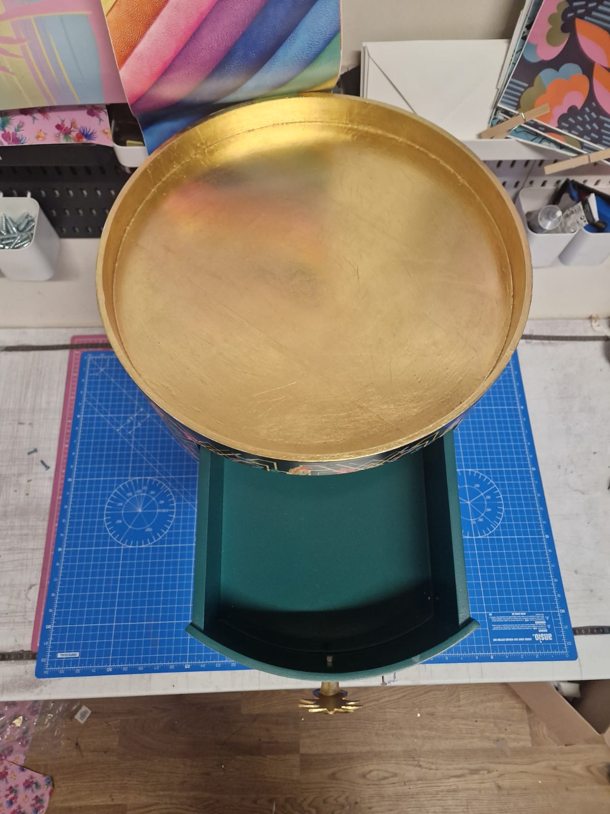 Gold Leaf top with emerald legs and inside of the drawer. Please note that due to its nature, a gold leaf top is much more textured than a painted one.