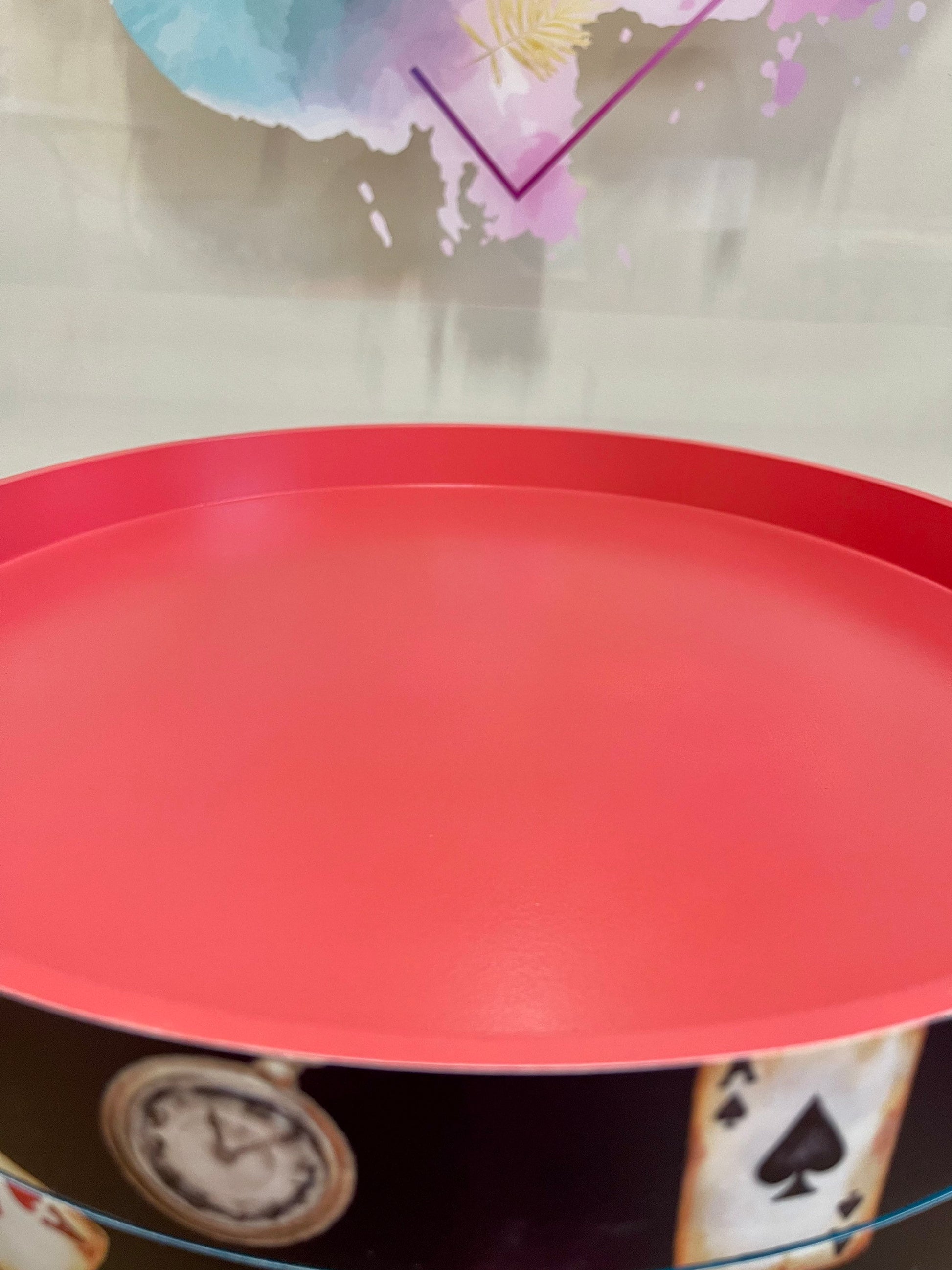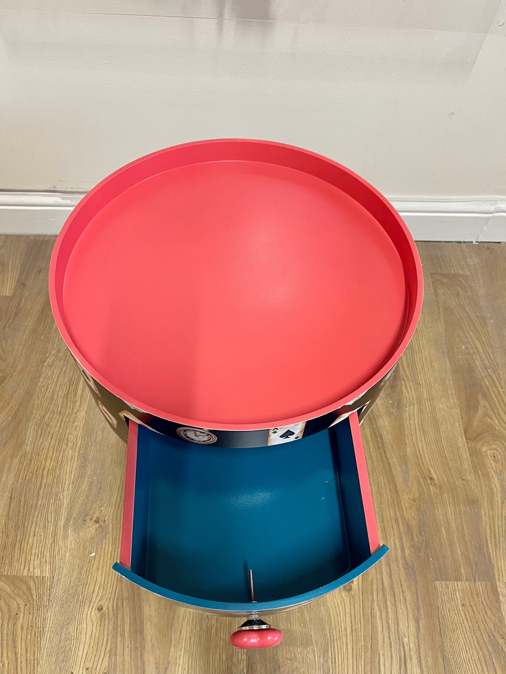 Round Alice in wonderland inspired nightstand.