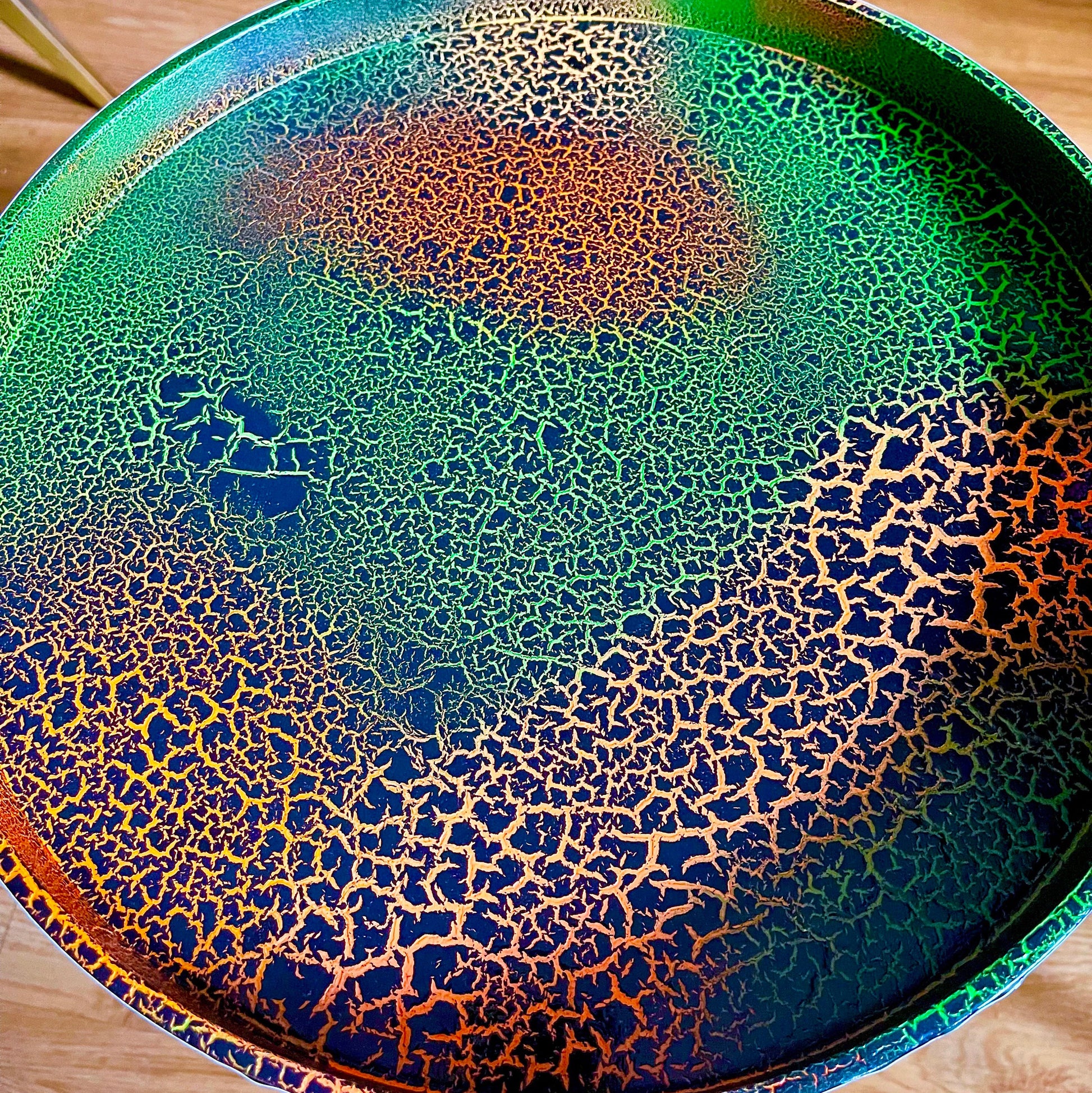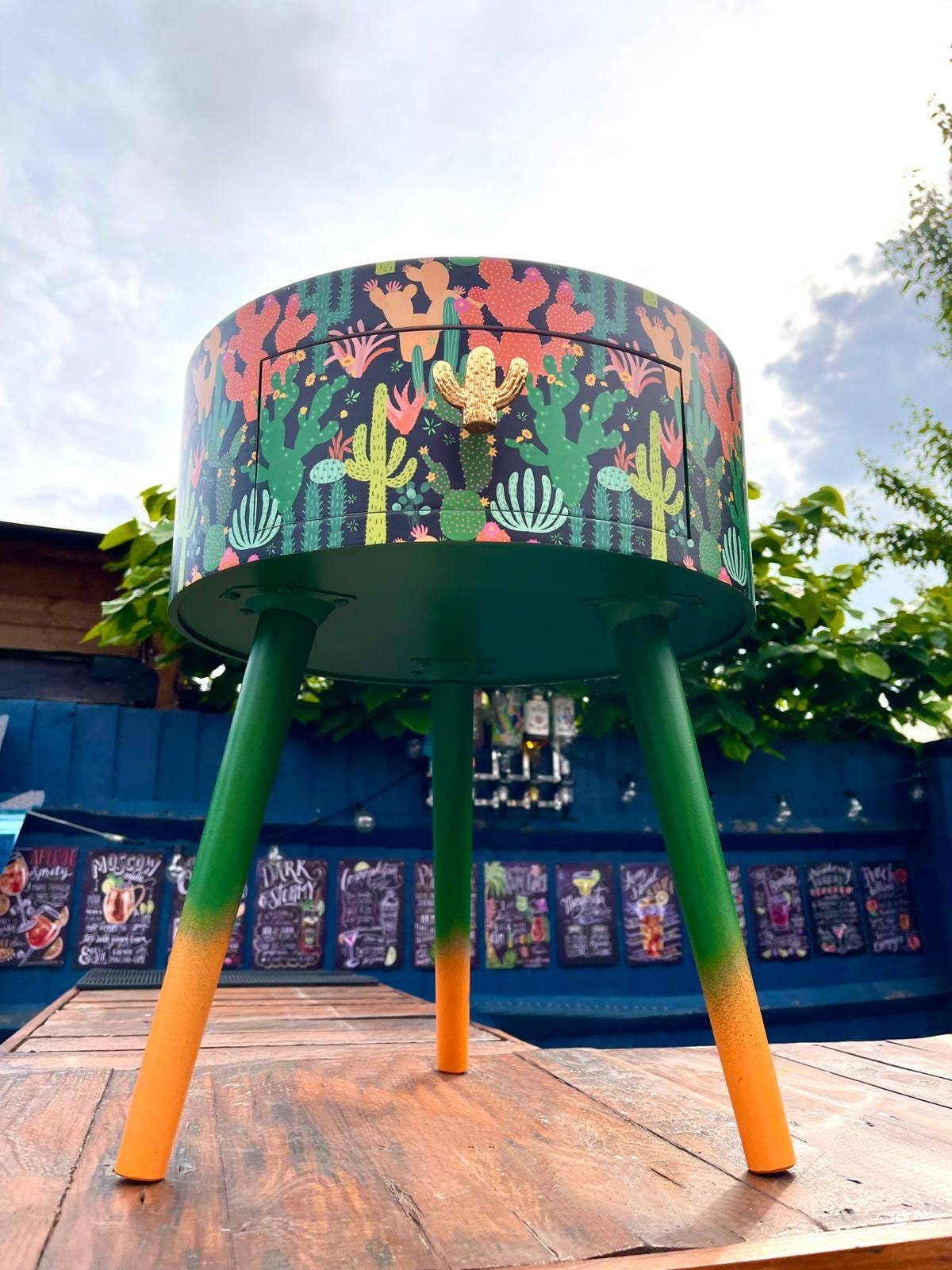 A special edition of our custom cabinets featuring the beautiful black cactus pattern, features matching green and orange ombre legs and a black crackle top showing hints of green and orange underneath and finished off with a beautiful golden colour cactus handle.