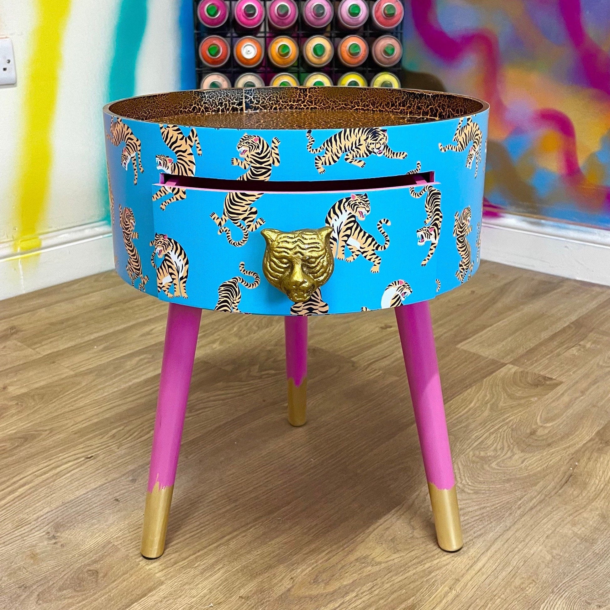 Tiger Table - Turquoise side table for bedroom, pink safari nursery decor girl, animal print tray top end tables with drawer, teenage girl room decor