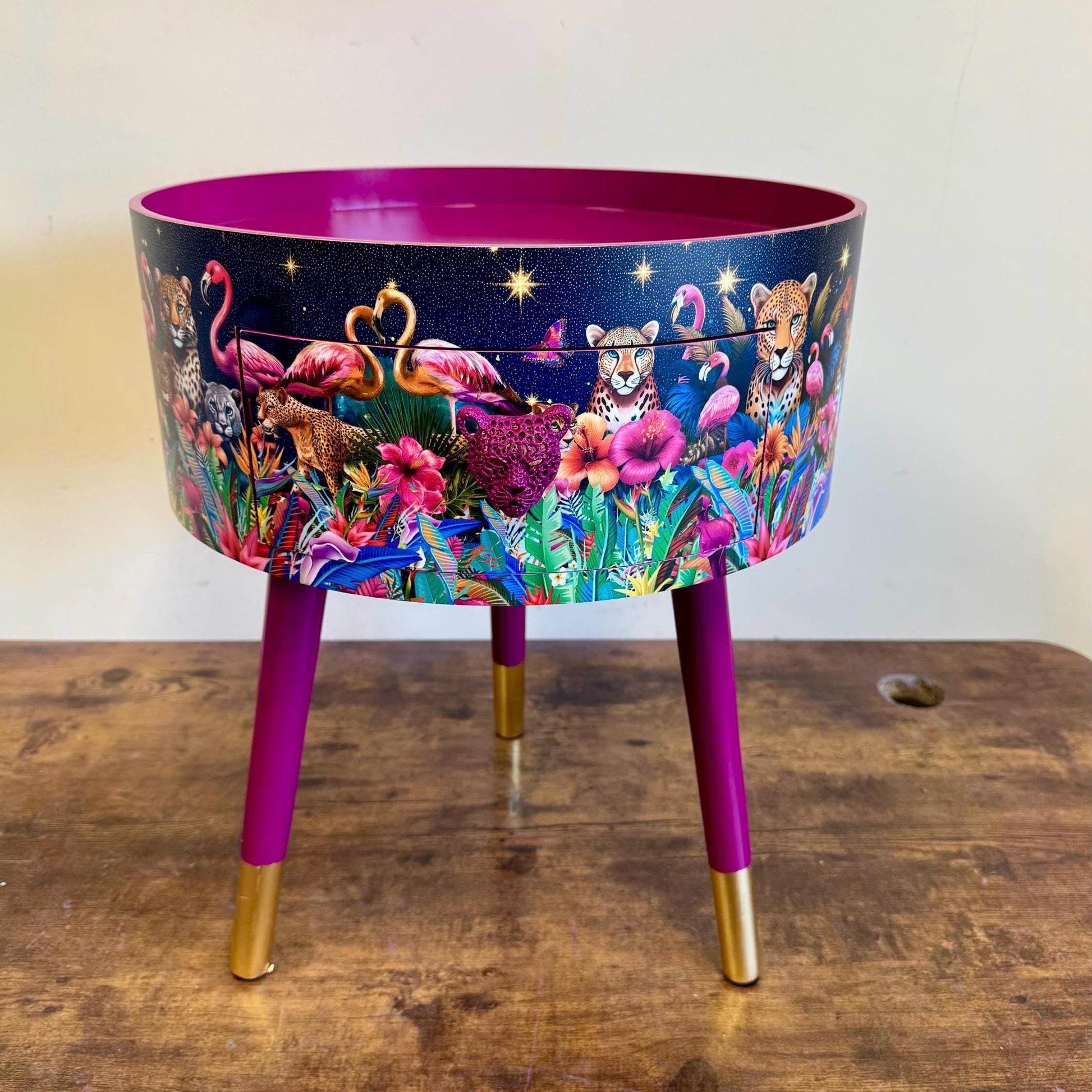 Rio Cheetah - Cherry blossom Pink flamingo and leopard dreamy table, celestial blue and gold design nightstand , colourful home decor round end table