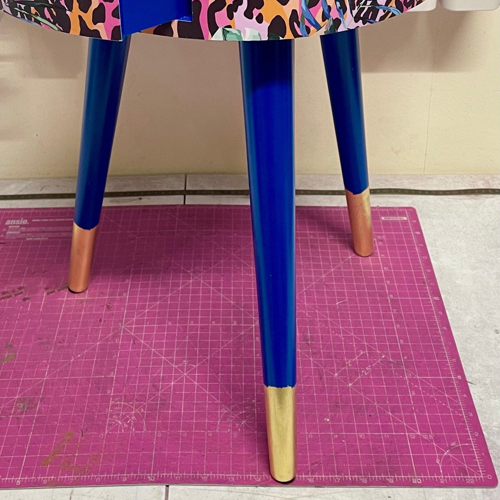 Leopard with Palm - Cobalt blue, pink and orange side table. Leopard print design with leaf design. Personalised round nightstand and side table.