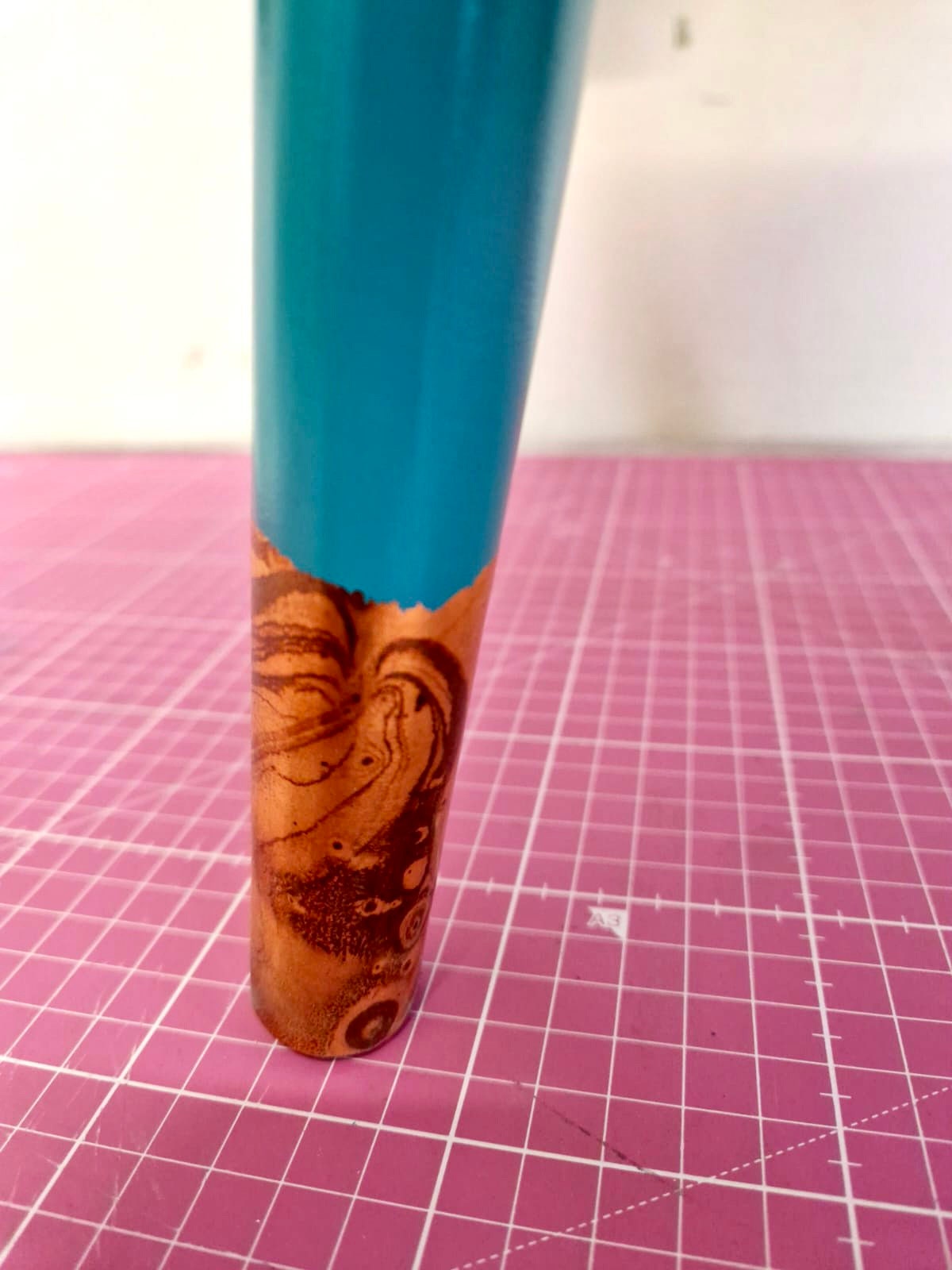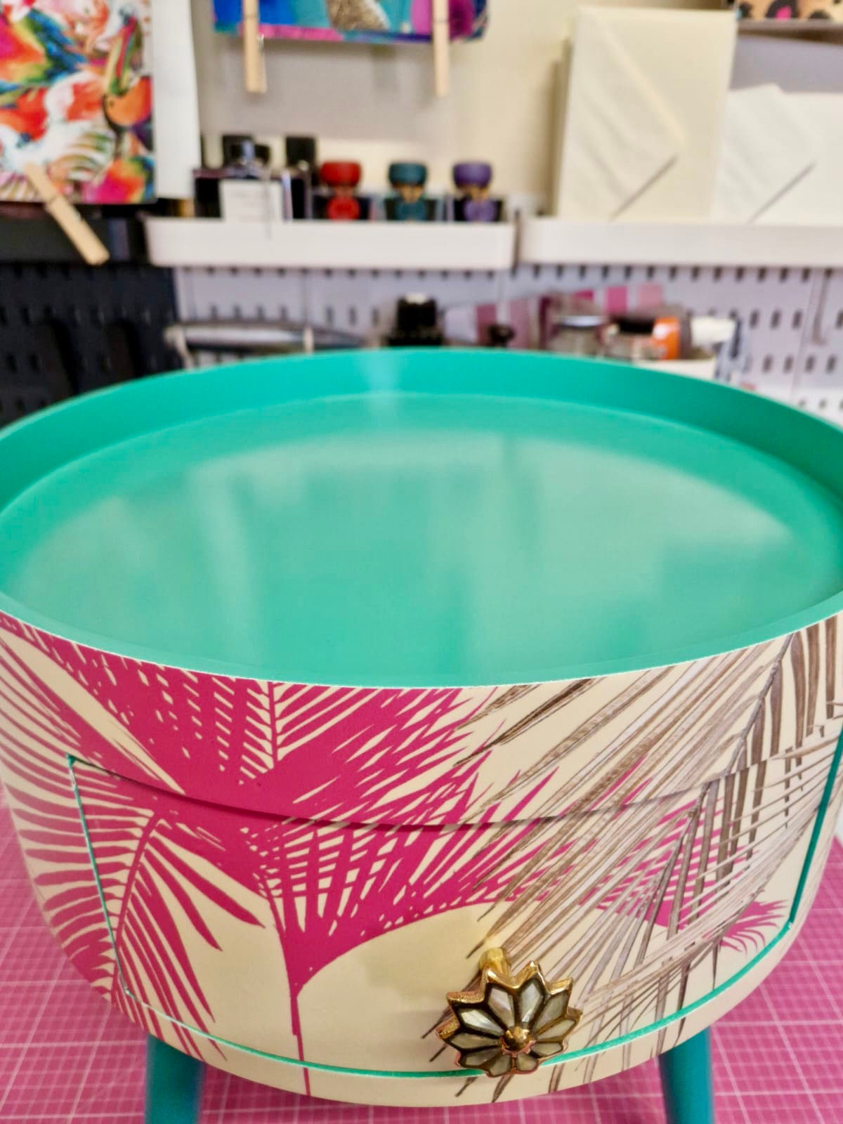 Pink and gold palm leaf print with a mint green top and darker mint green legs. The legs are finished with marble swirled real metallic leaf tips that are bronze coloured. The real metallic leaf is the reason this table is a slightly more premium price than our standard tables