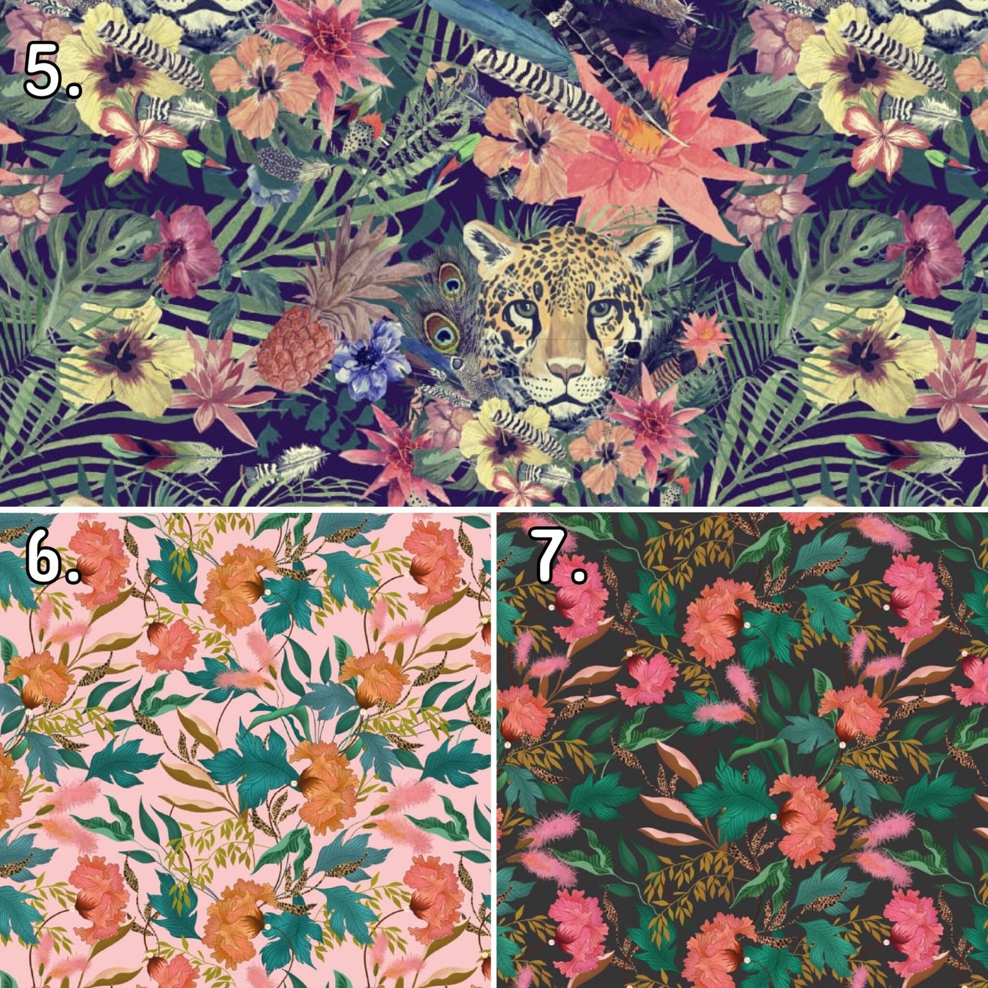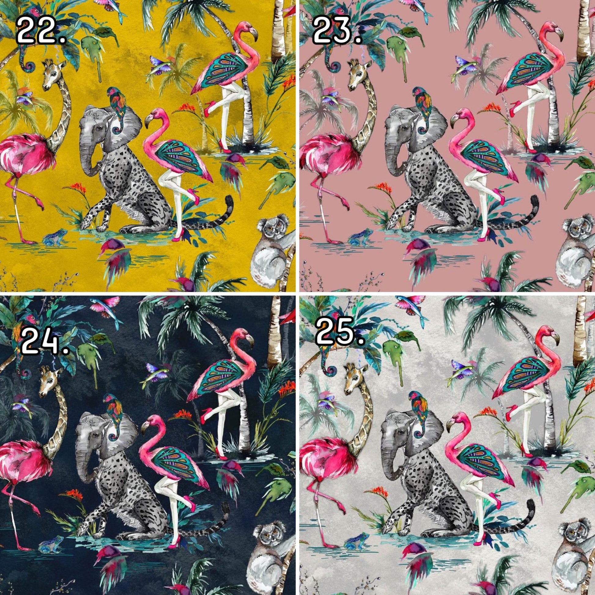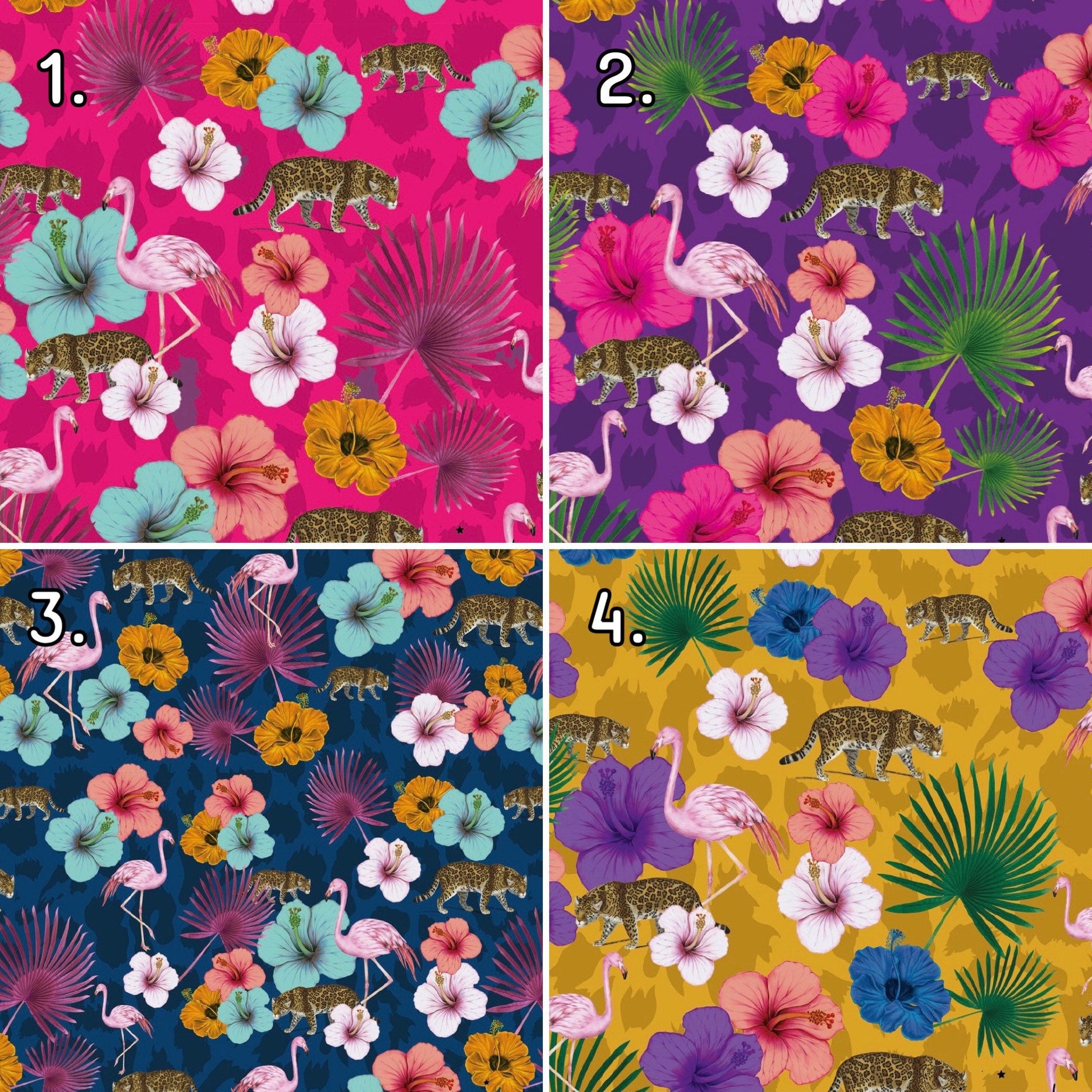 Beautiful side table in blue pattern with flamingos and cheetahs, tropical floral pattern.