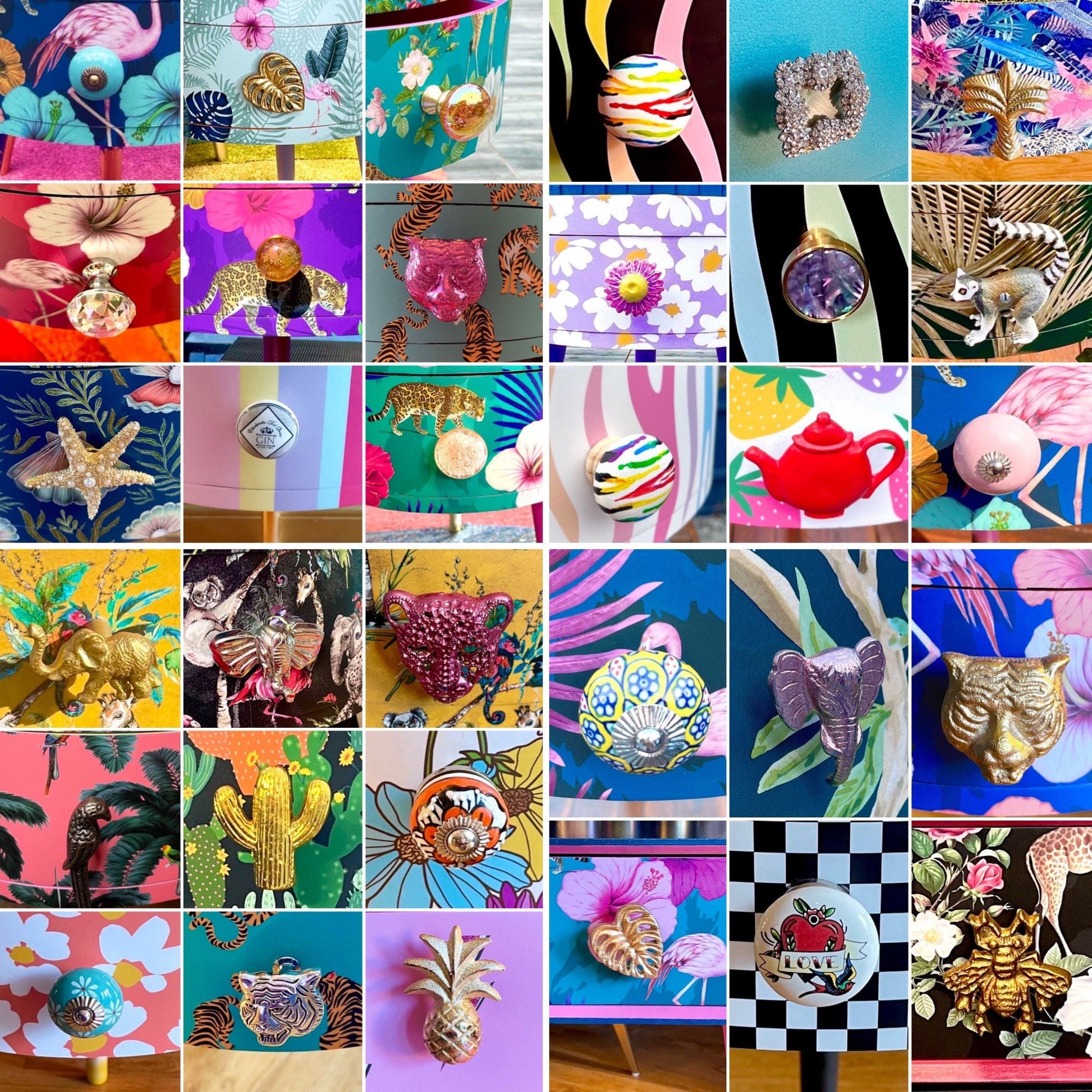 Flocking Fab - Navy and Mustard bedside table completely personalised. Pink, yellow and navy living room side table, ideal nightstand.