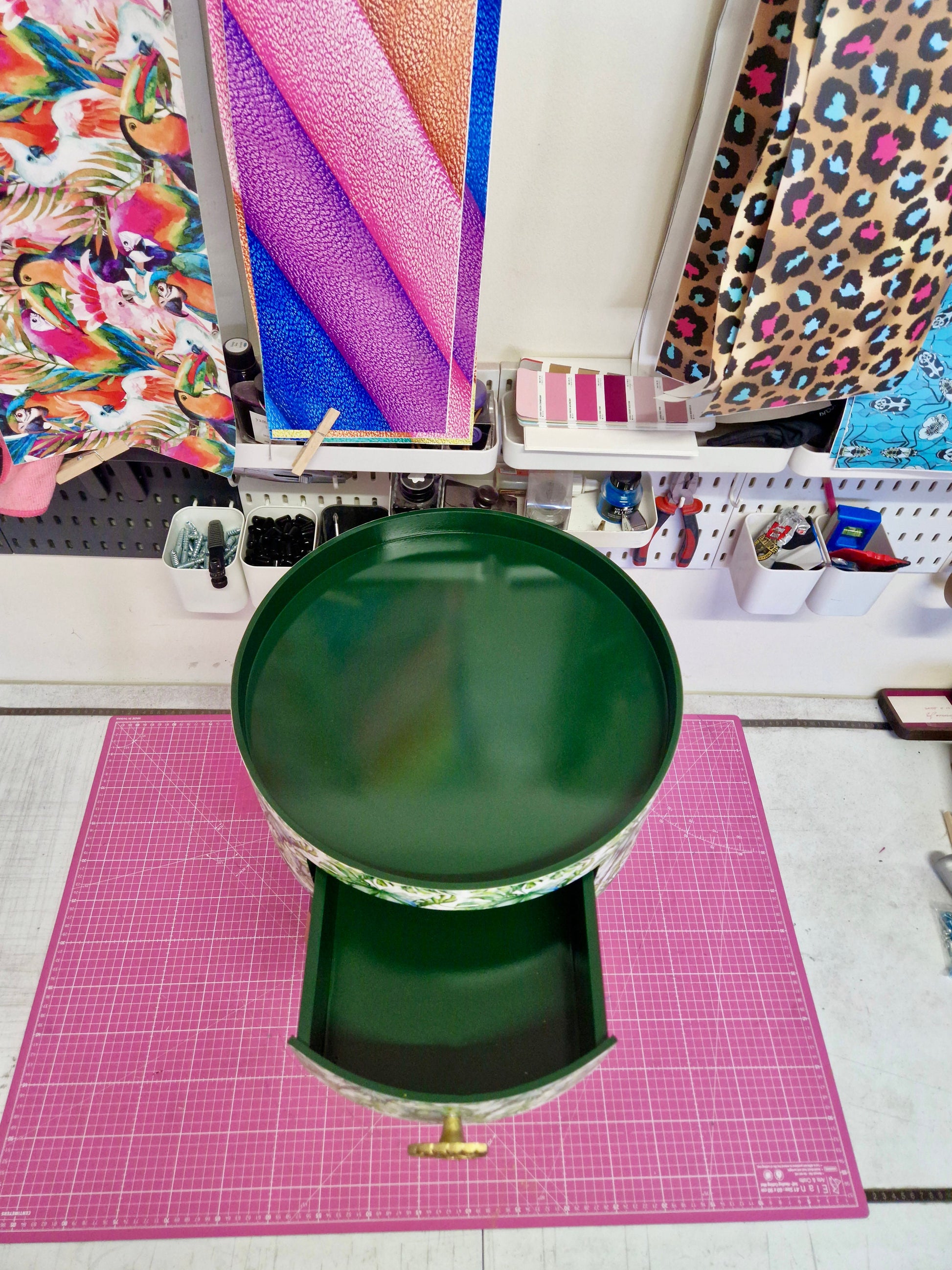 The top and legs are finished in a beautiful jungle green colour, and the table is completed with a gold cheese leaf handle