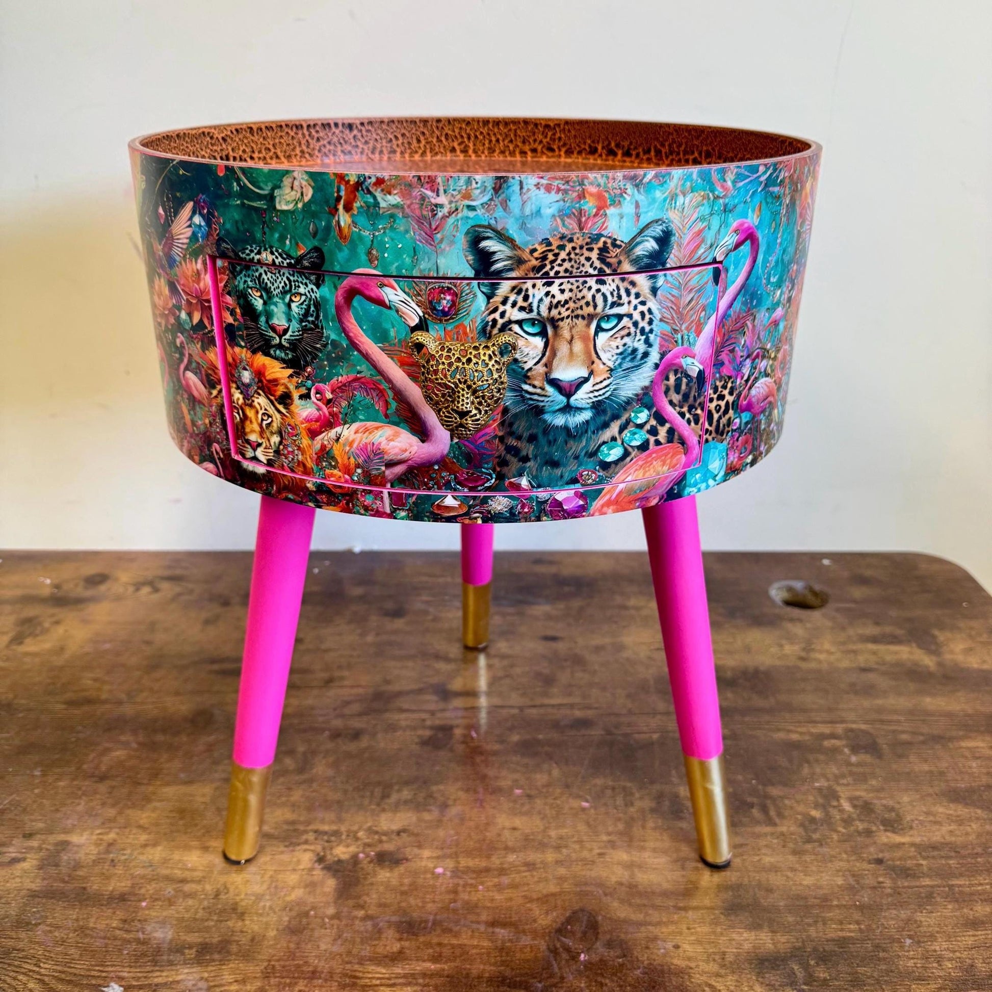 Jewel Leopard - Hot Pink flamingo and leopard beside table, tiger top, teal cheetah jewel design nightstand with gold , colourful home decor round end table