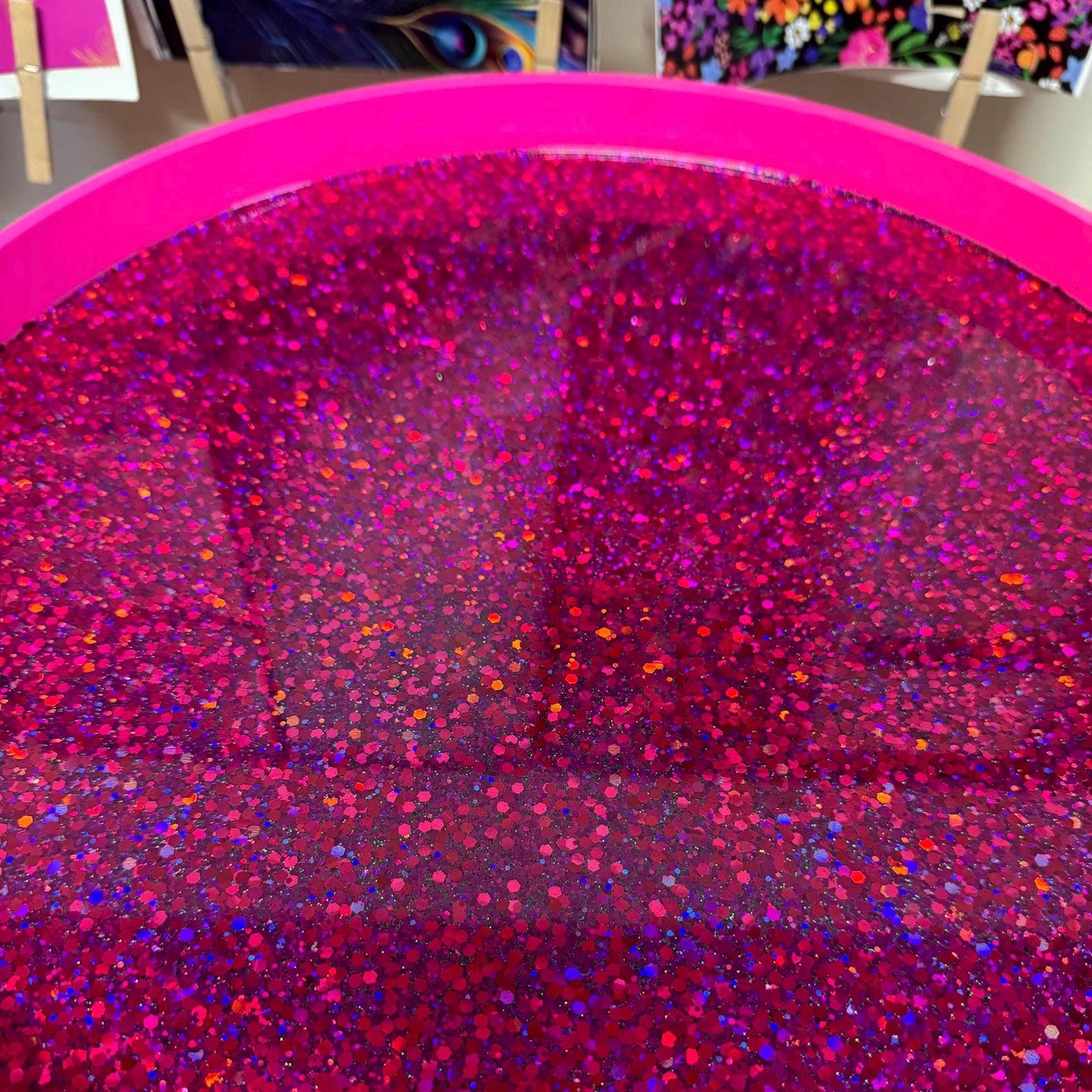 This is a beautiful hot pink design with golden bees on it, matching hot pink lip and inside of the drawer. gold painted legs with hot pink tips. The top is a Fuscia holographic glitter.