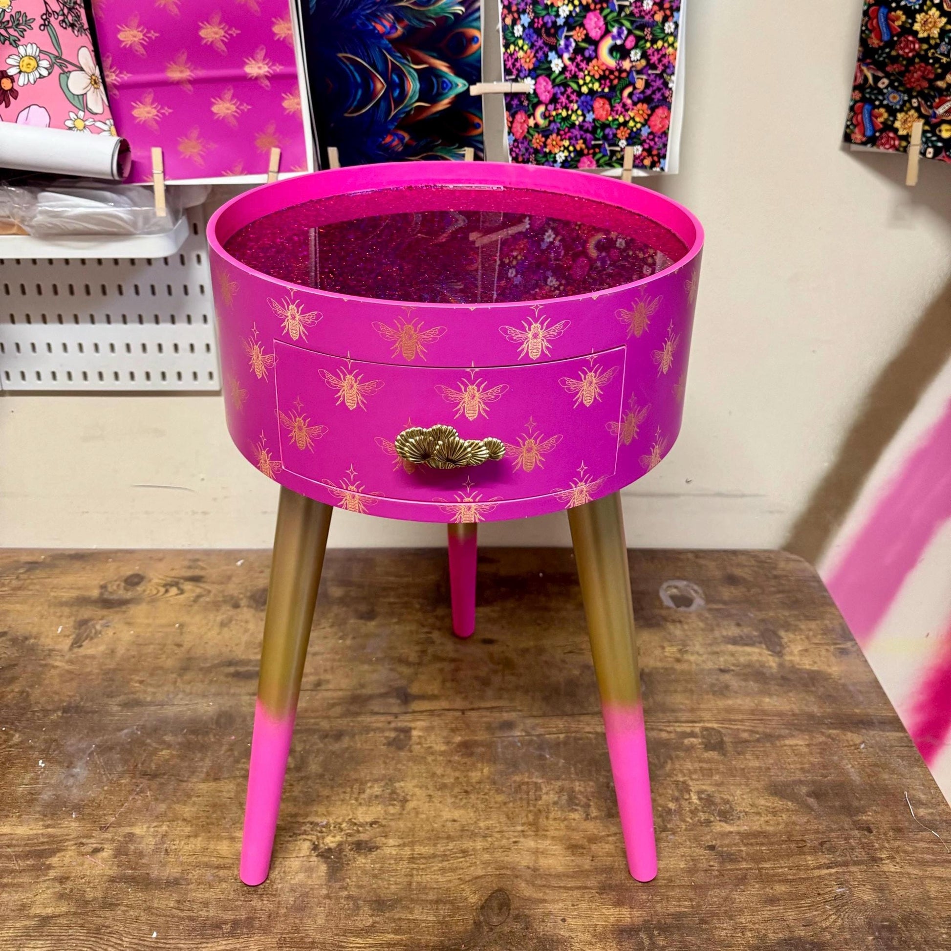 Art deco - Hot Pink gold bees round bedside table. Fun Bright Home Decor . Ideal for Nightstand side table. Fuscia glitter top, gold legs