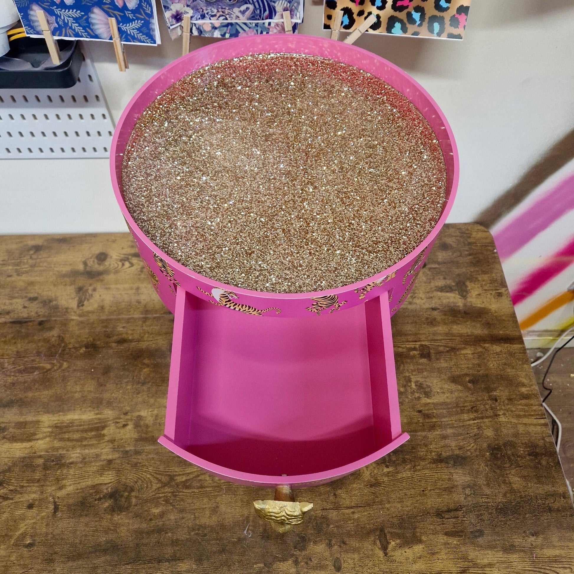 Tiger Table - Hot Pink round bedside table gold glitter top . Fun Bright Home Decor . Ideal for Nightstand or side table. Comes with inbuilt drawer