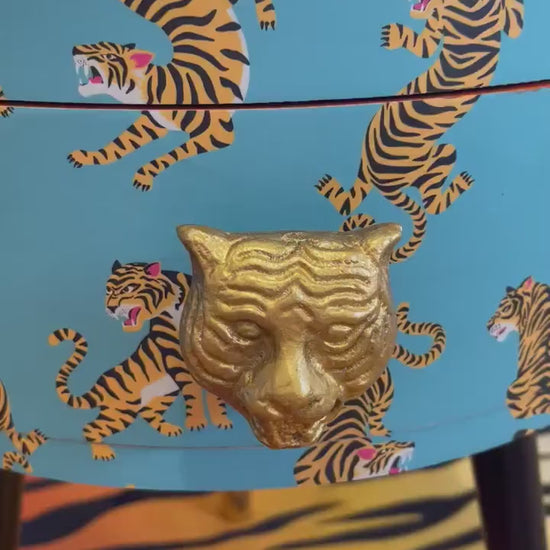 Tiger Table - Turquoise and orange tiger bedside table with gold handle . Ideal for nightstand or sidetable . Round table with drawer. Customisable
