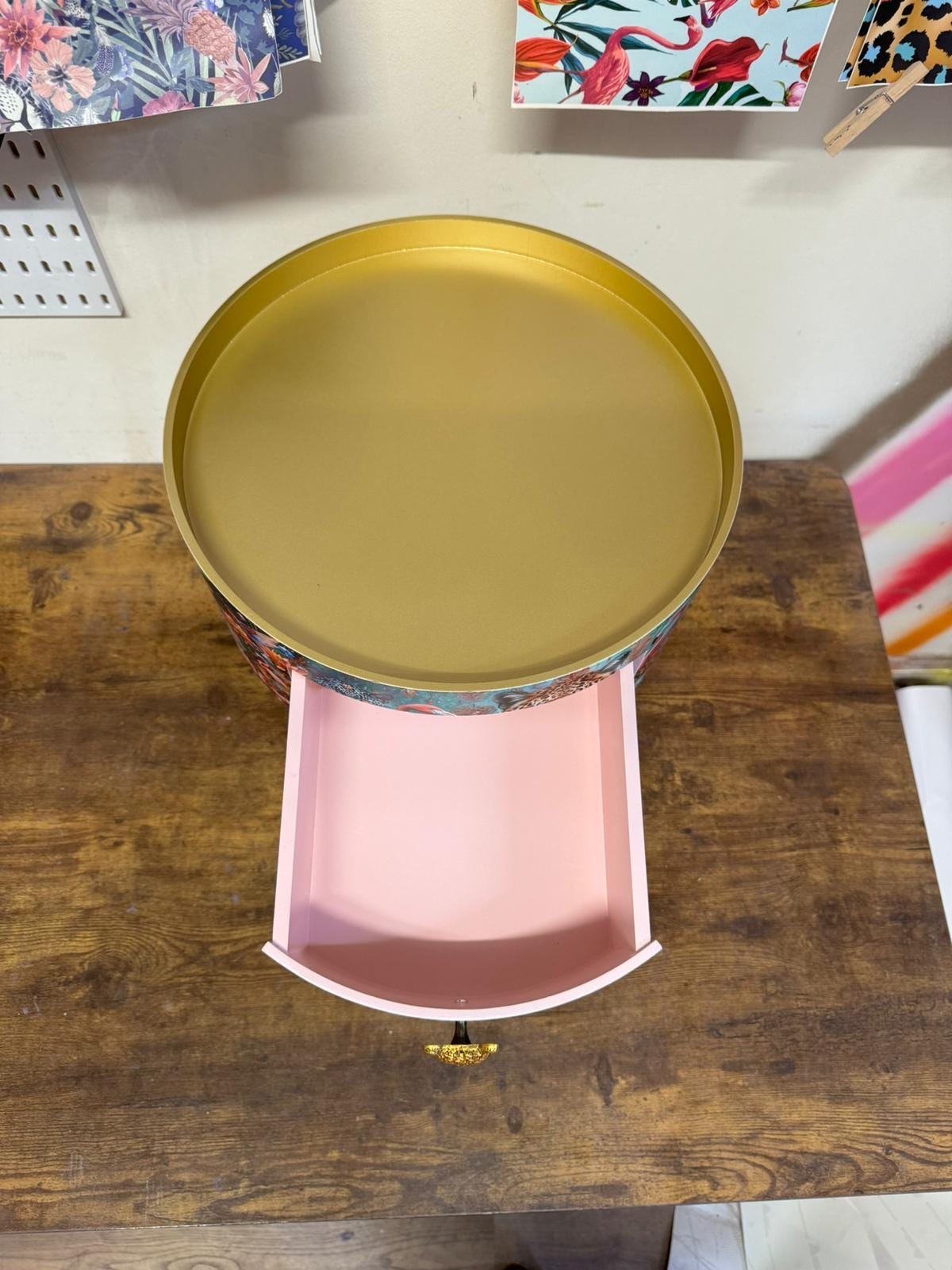 Jewel Leopard - Light Pink and Gold flamingo and leopard beside table, teal cheetah jewel design nightstand with gold , colourful home decor round end table