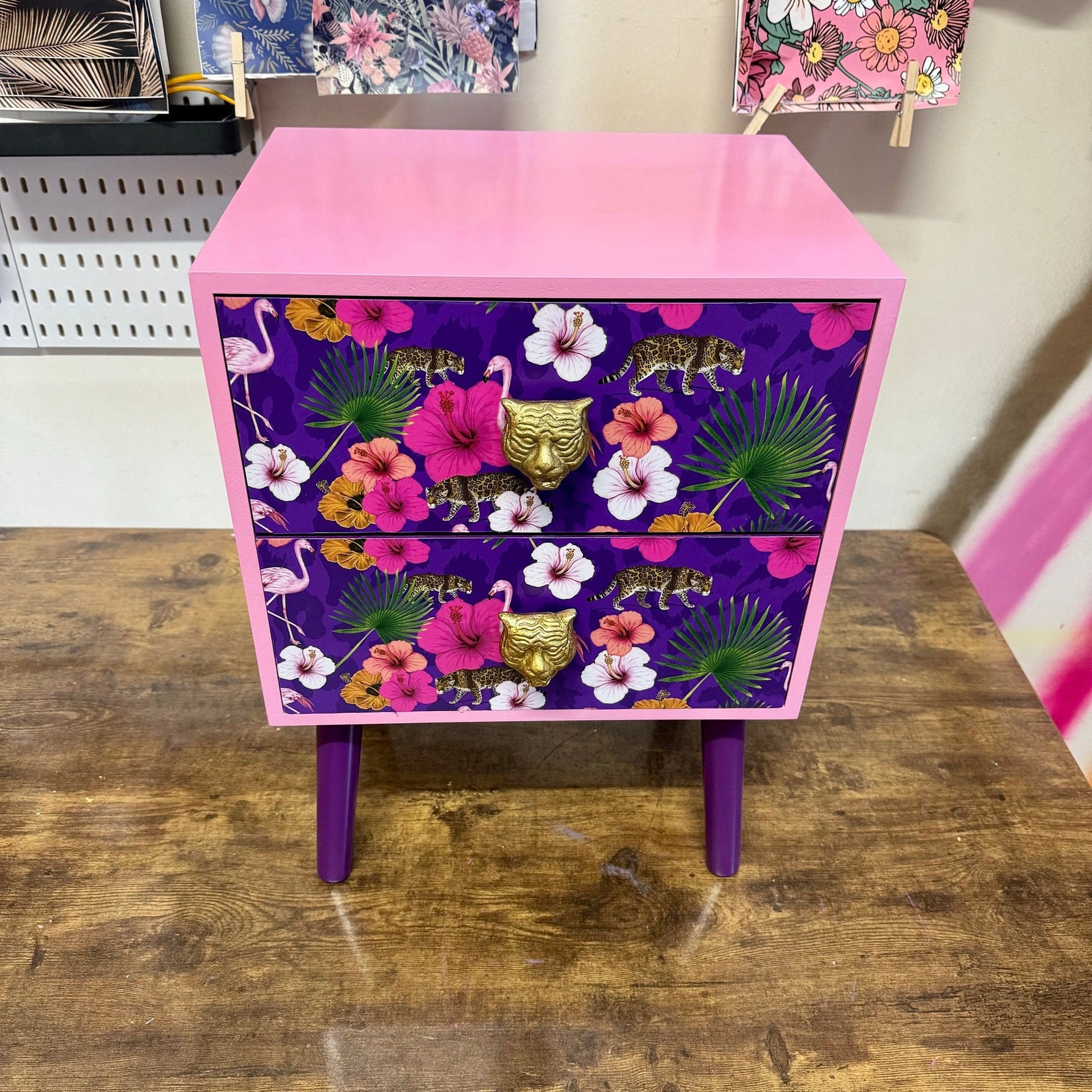 Light Pink and purple square bedside table, two drawers, ideal nightstand. Flamingo leopard and tropical leaf design. Customisable end table