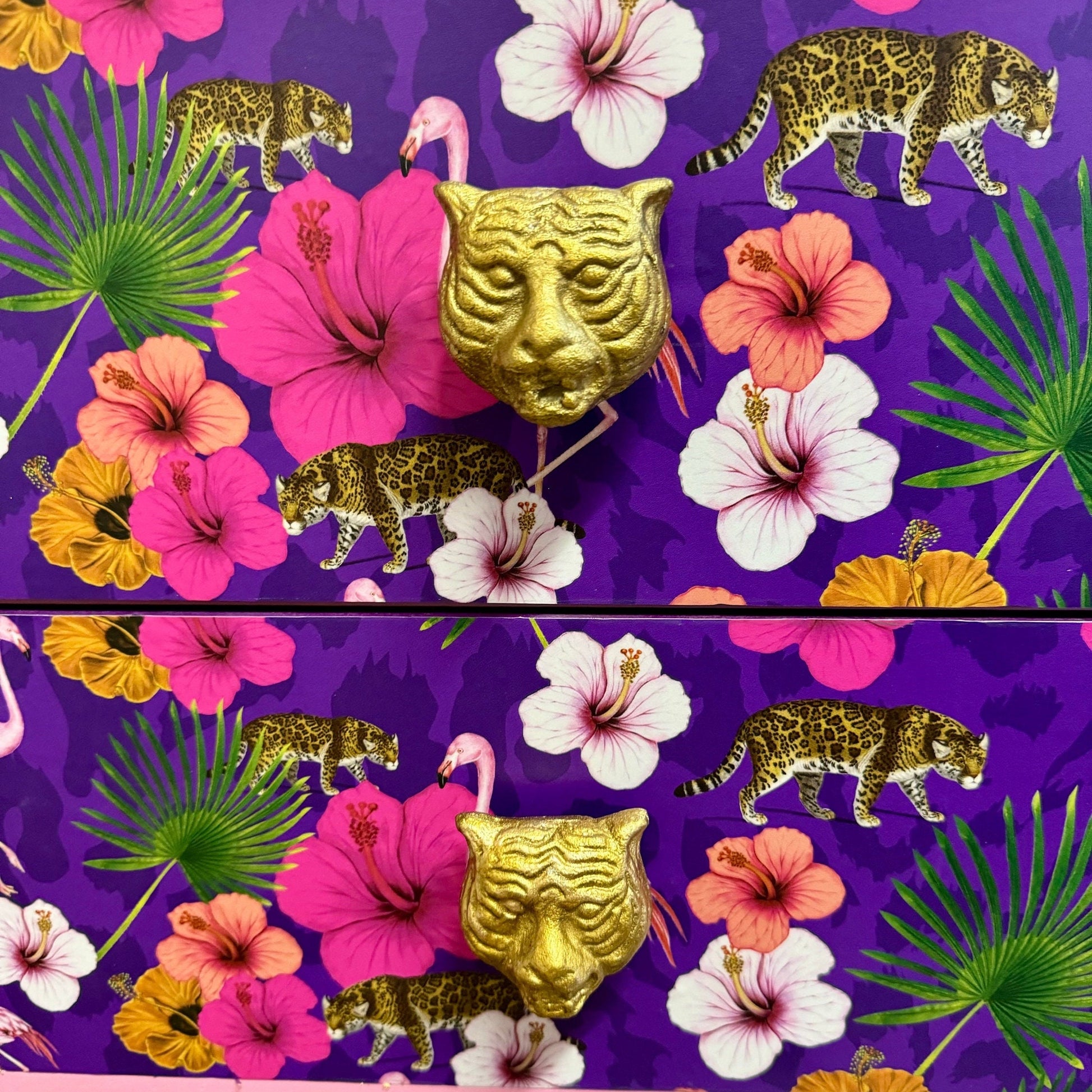 The design on the drawers is a beautiful purple flamingo, leopard and floral design printed on high quality vinyl and applied to the table.