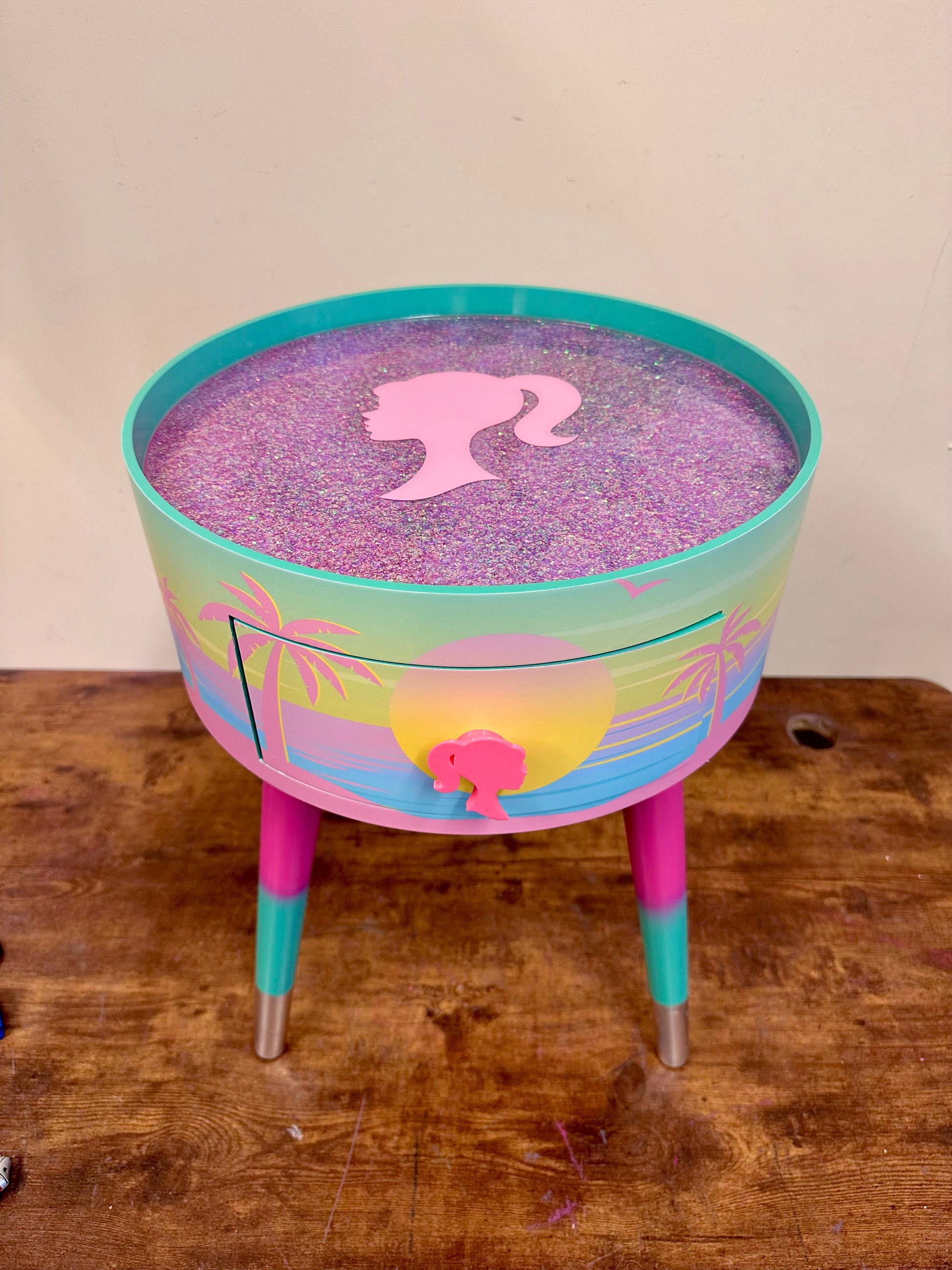 Malibu - Pink with Glitter and Barbie on top. mint and pink ombre, sunset, flamingo, Palm Springs nightstand , doll detail, taller legs