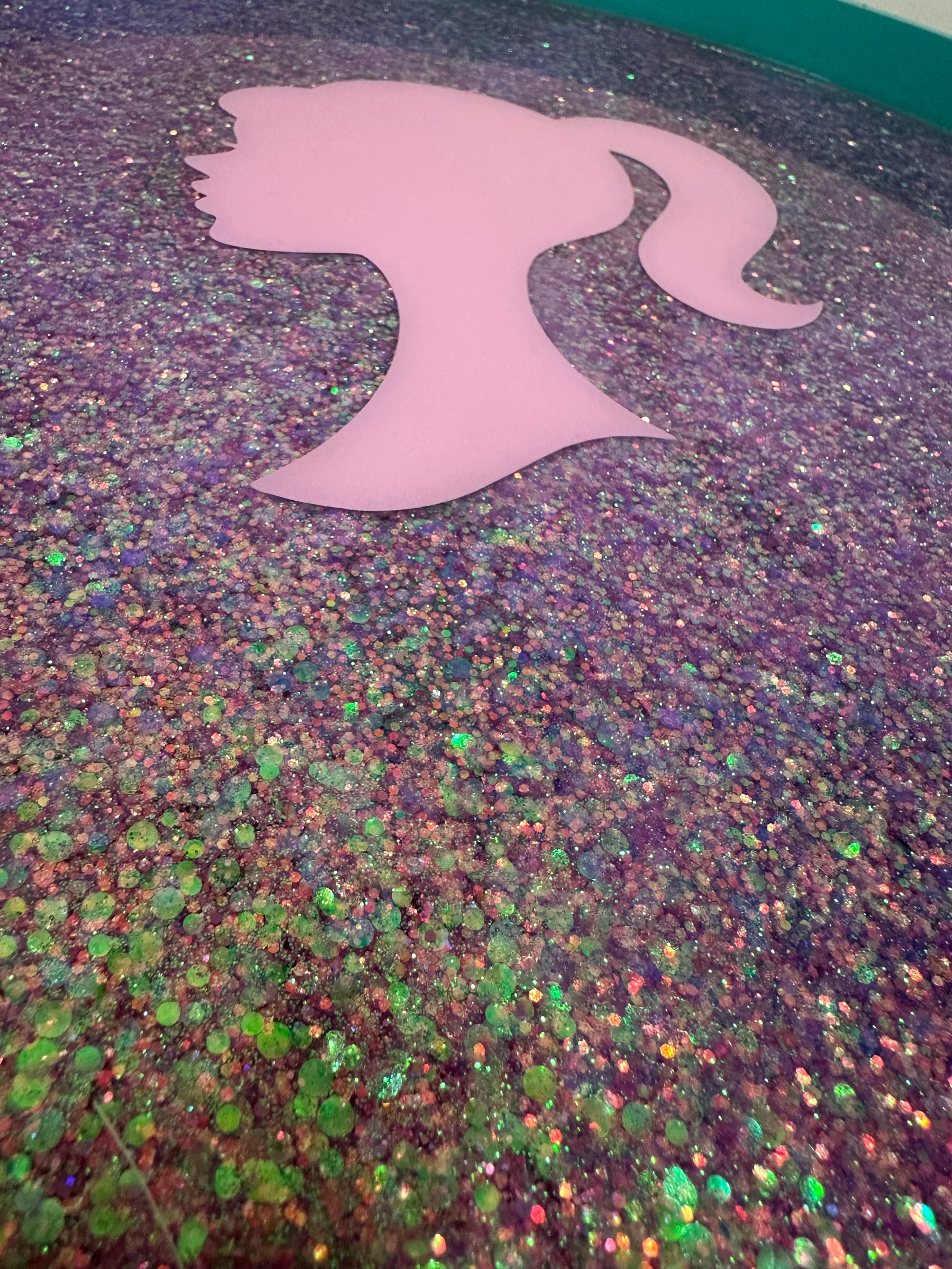 The top is mint green with a mermaid holographic glitter on top and then finished with a light pink barbie head and finished under a layer of resin.