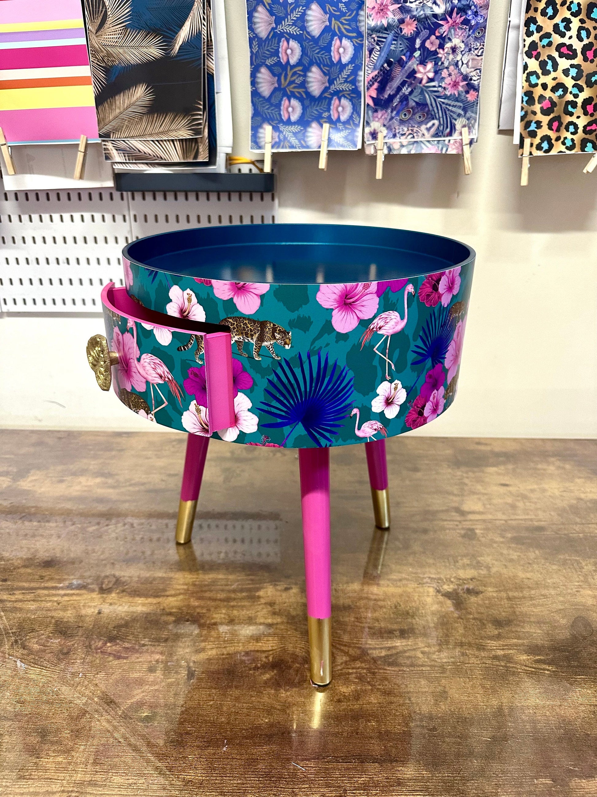 Flocking Fab - Aqua , Pink and Teal Blue tropical side table . Flamingo and leopard print nightstand , bedside table , flamingo and cheetah design end table