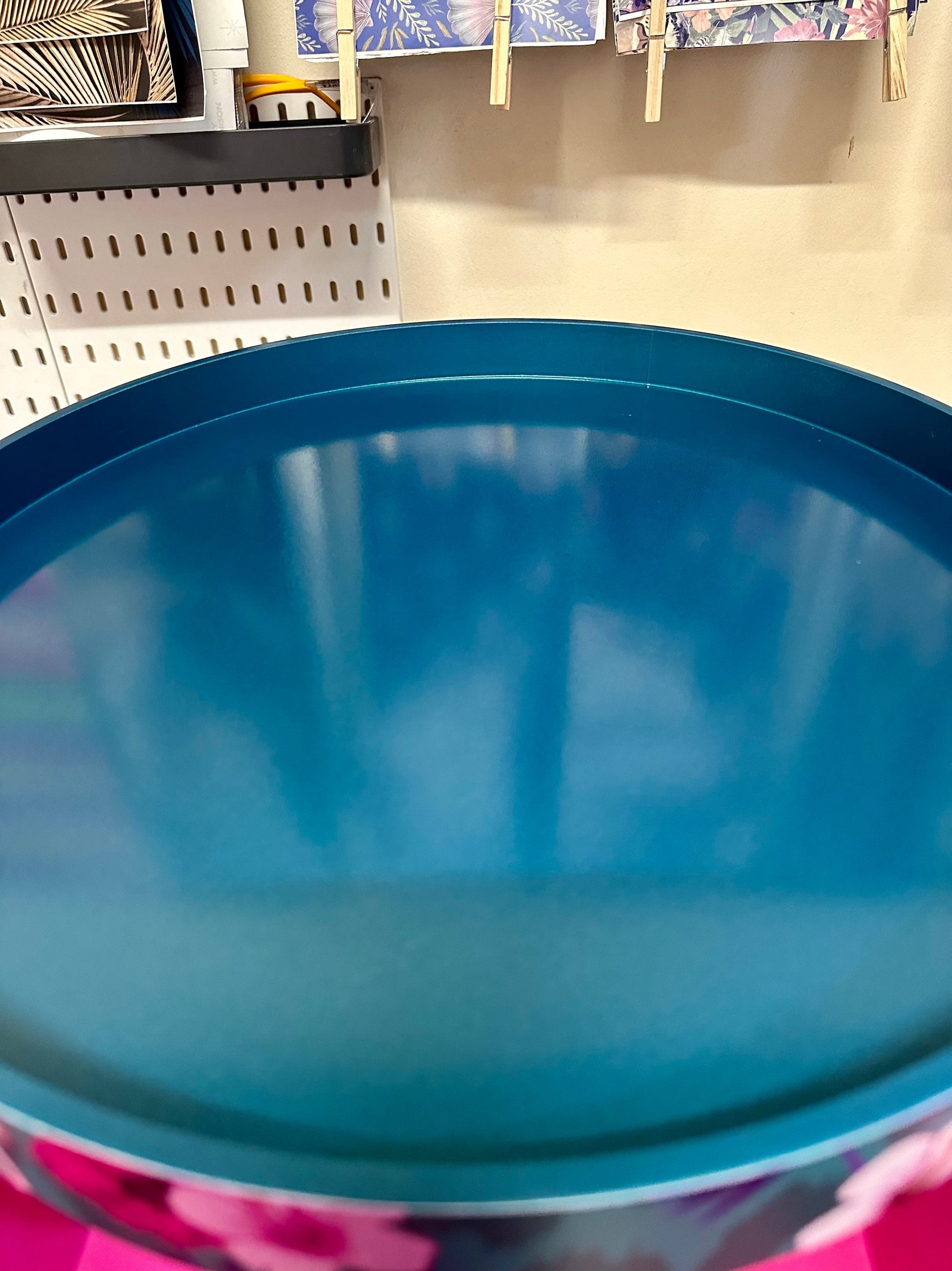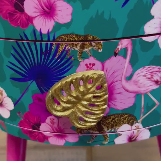 Metallic blue top with a stunning aqua and teal tropical design on the front in leopard and flamingo design with accents of pink. The design is made digitally and then printed onto high quality vinyl and applied to the nightstand.