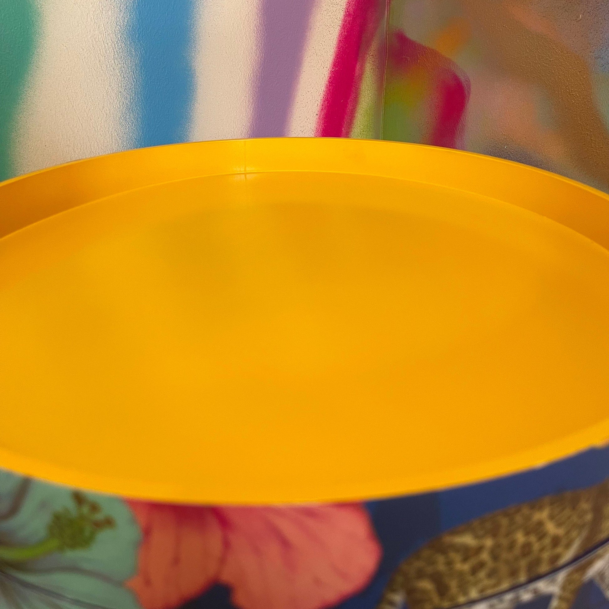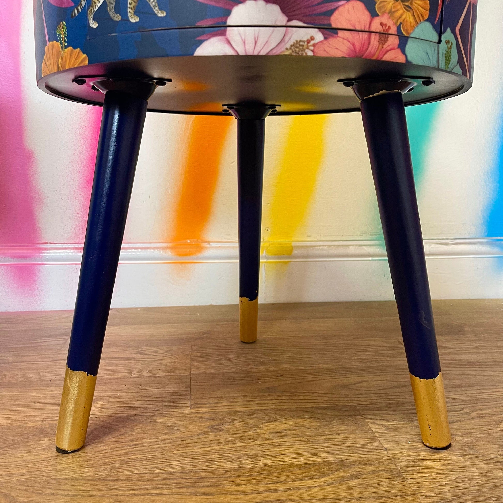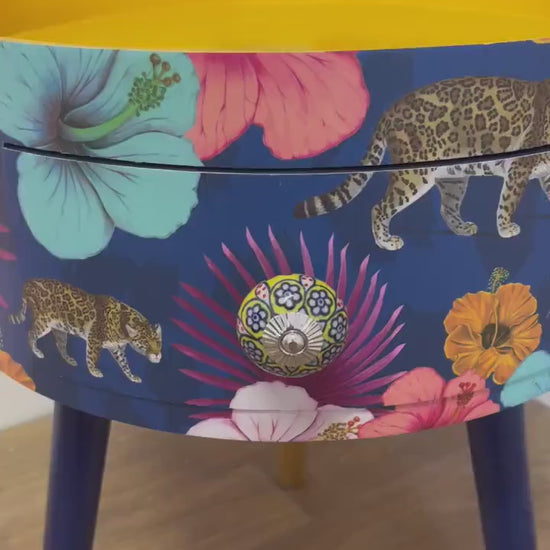 Flocking Fab - Navy Round bedside table with drawer, navy and yellow nightstand with tropical and leopard design. Blue side table with storage, eclectic table