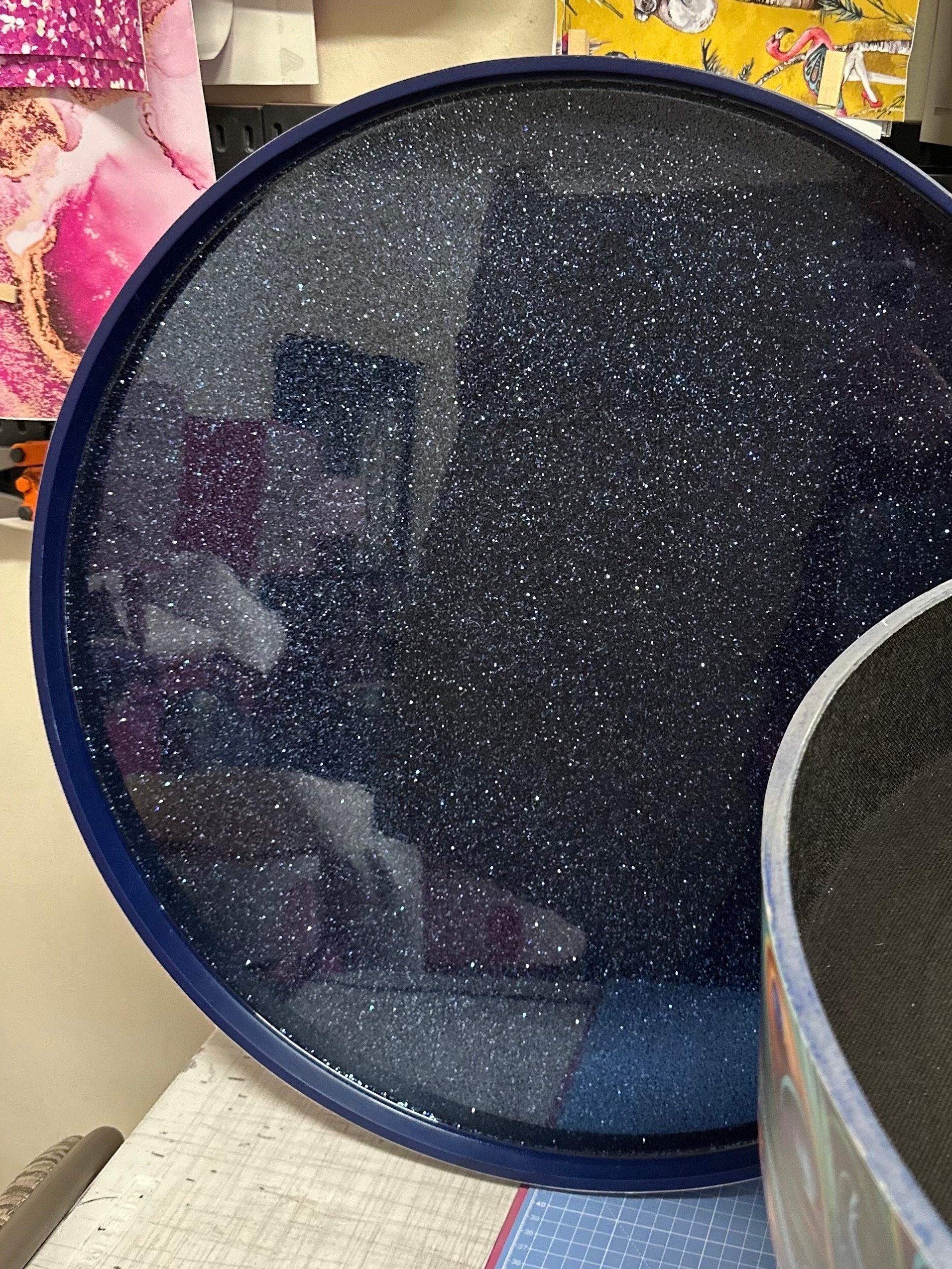 The top is finished in a complimentary Navy Blue and then has a layer of navy blue glitter set under epoxy resin, and the legs are an emerald green and blue ombre , finished with a silver leaf tip.