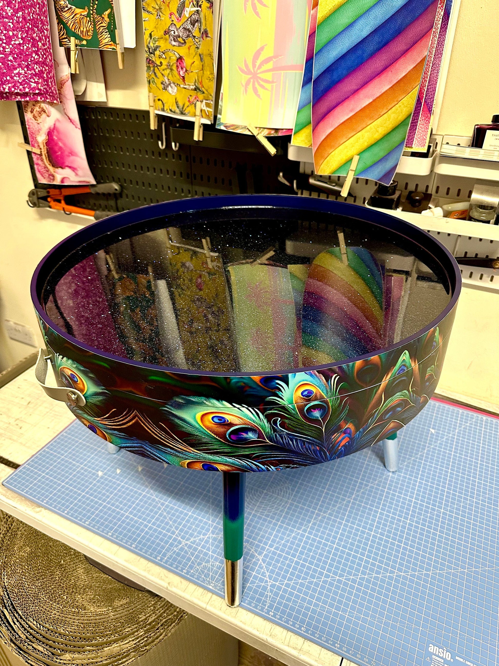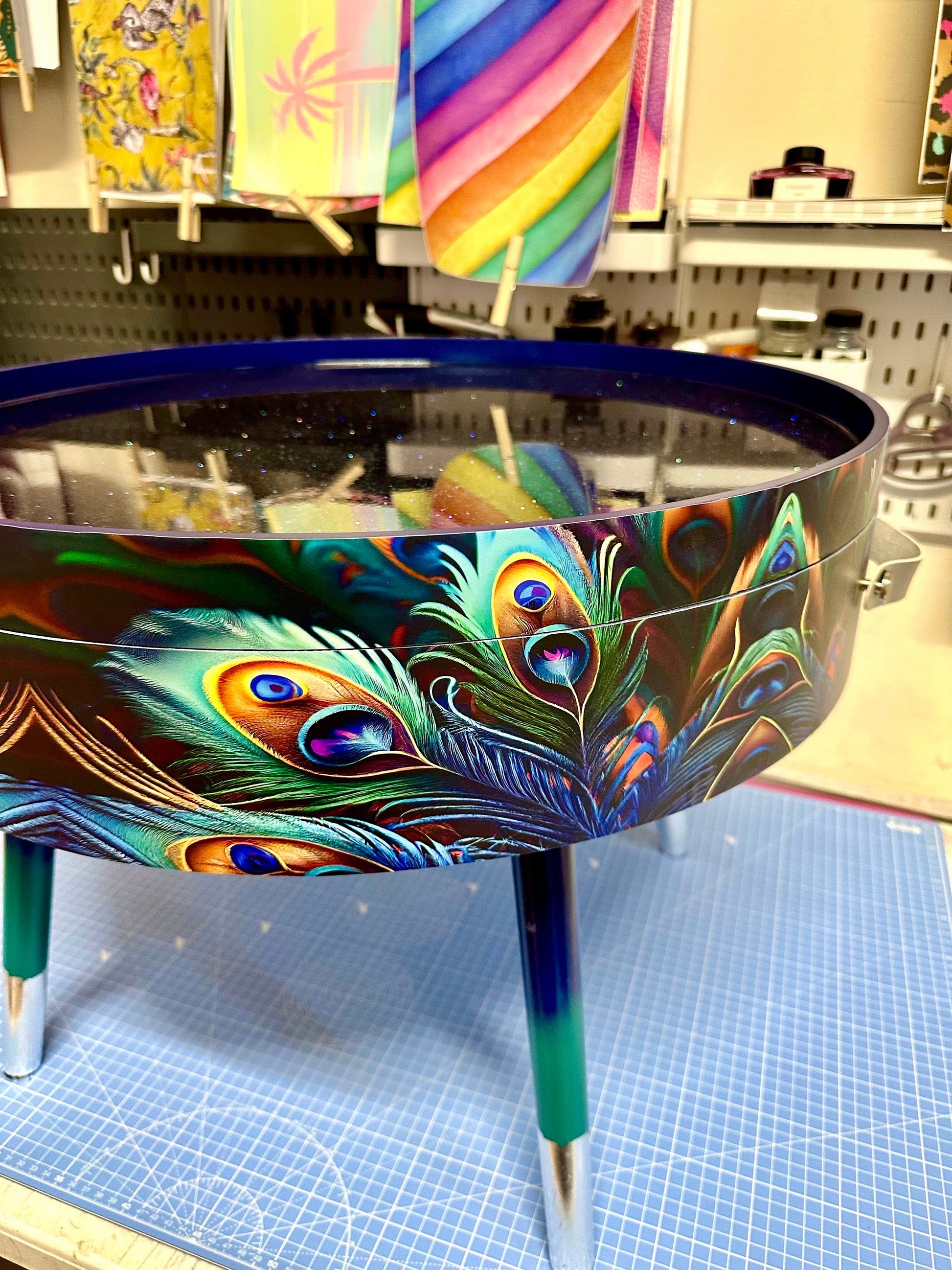 Round coffee table , peacock design, blue, teal turquoise feathers. Navy Glitter . Round table, lift off top for storage. End table lounge