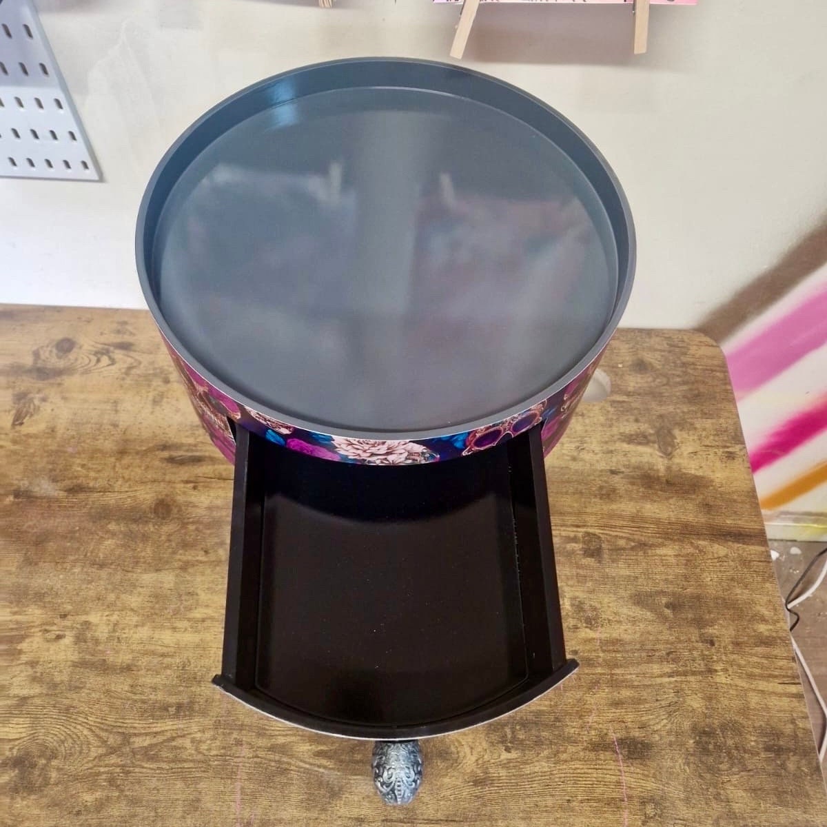 Skull design bedside table. Purple and black skull and roses, gothic inspired nightstand. Grey floral day of the dead end table